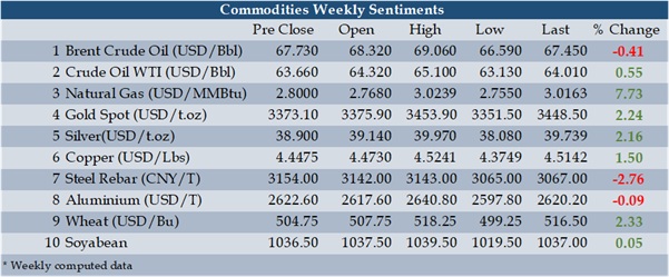 Natural Gas posted 7.73 percent gain reversing the last five-week negative sentiments since weather forecast pointed to a stronger demand. Gold prices again gained momentum after consolidating from last April onwards because uncertainties increased after escalation of friction of global trade intensified when India started buying crude oil from Russia. The solidarity of BRICS nations to fight against turbulence in global economy had brought more hurdles for US economic efforts to stay with global supremacy. Silver also moved in tandem with gold but gained more strength from strong fundamentals triggered by Chinese solar boom. Weekly gain in wheat futures had nothing to offer to reverse its ongoing bearish hug because ample global harvest and favourable weather weighted on the sentiments. The sluggish sentiments in property and real estate sector helped the bear to have a strong grip over steel futures.