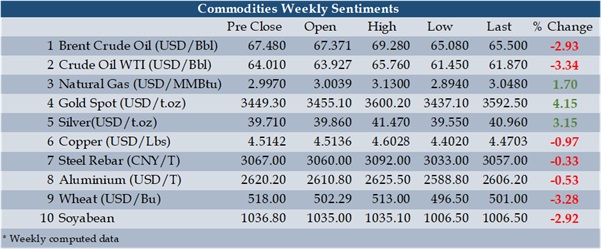 Apart from precious metal, most of commodities showed  bearish sentiments for the week . The modest production hike by OPEC countries together with Russian supply to India and China with good discount had detrimentally affected the oil prices. The sluggish demand for oil continued to strain the prices even though  Chinese stock piling of oil continue to add some cushion for market. The expectation of fed reserve rate cut had further strengthened the gold prices which already moving on a bullish path due to geopolitical unrest. The central banks buying together with major inflows towards gold ETF also supported the sentiments. Robust harvest had further weakened the prices of wheat.